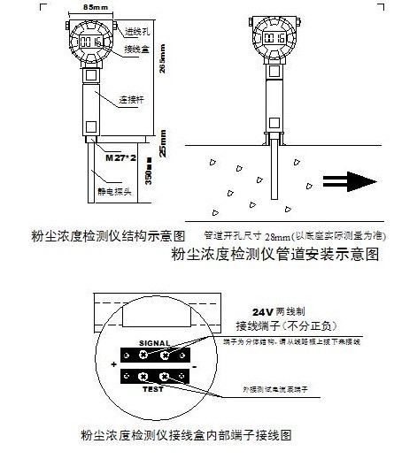 4 、接線盒內置一體化變送器輸出的4-20mA 電流與粉塵感應探針之間電氣隔離,實現(xiàn)信號的安全傳輸。