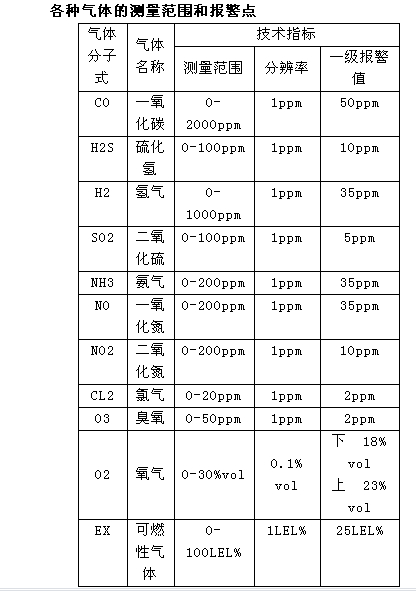 響應(yīng)時間:氧氣<30s;一氧化碳<40s;可燃氣<20s;硫化氫<30s(其他略)