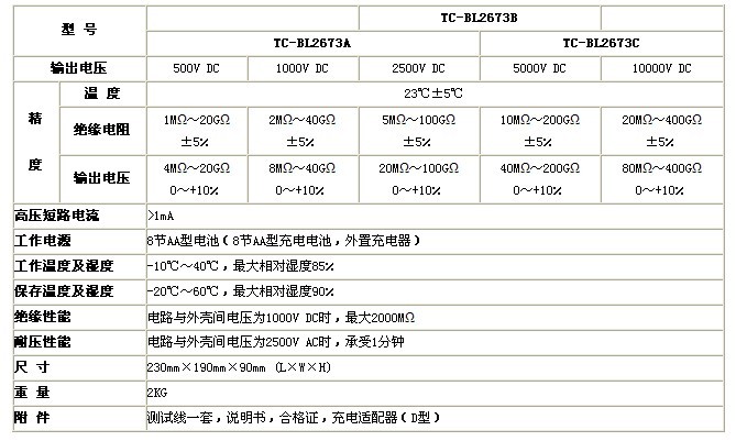 1、TC-BL2673B型在2500V  高可測(cè)100GΩ, 在5000V 高可測(cè)200GΩ;